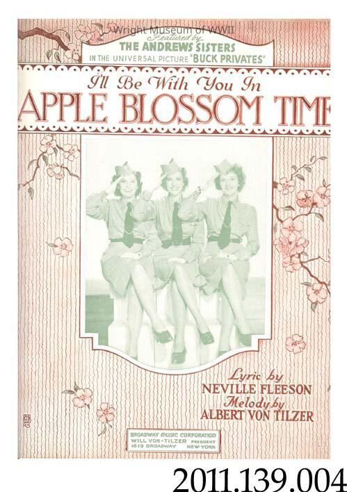 Piece of sheet music: "I'll Be with You in Apple Blossom Time". One sheet of paper, folded, with music printed on both inside pages. "Featured by the Andrews Sisters in the Universal Picture 'Buck Pirates'". Color printed covers showing black and white photograph of the Andrews Sisters in Army uniforms, saluting. Music has a copyright date of 1920, but the film Buck Pirates came out in 1941.Update Date