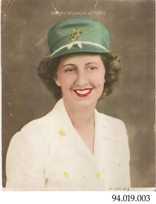 Hand-colored black and white photograph (half portrait) of a woman (Jeannette Riordan) in USMC uniform. Subject wears a white jacket with gold buttons and a green cap with gold colored pin at front, center. Hand-coloring includes bright red lipstick, rosy cheeks, brown hair, green cap with white trim, and white jacket with yellow buttons. Photographer stamp on reverse: "Photograph Studio of / DENHOLM & MCKAY / WORCESTER, MASS.". Initials handwritten in pencil on reverse at bottom: "RFJ".Update Date