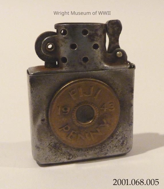 Bottom portion of a Zippo lighter. Lid and wick are missing. Glued or soldered to one side is a coin, New Zealand sixpence, dated 1944. Glued or soldered to the other side is a coin, Fiji penny, dated 1943. Engraved on bottom is "ZIPPO" and "PAT. 29326?9" and "MADE IN U.S.A."Update Date