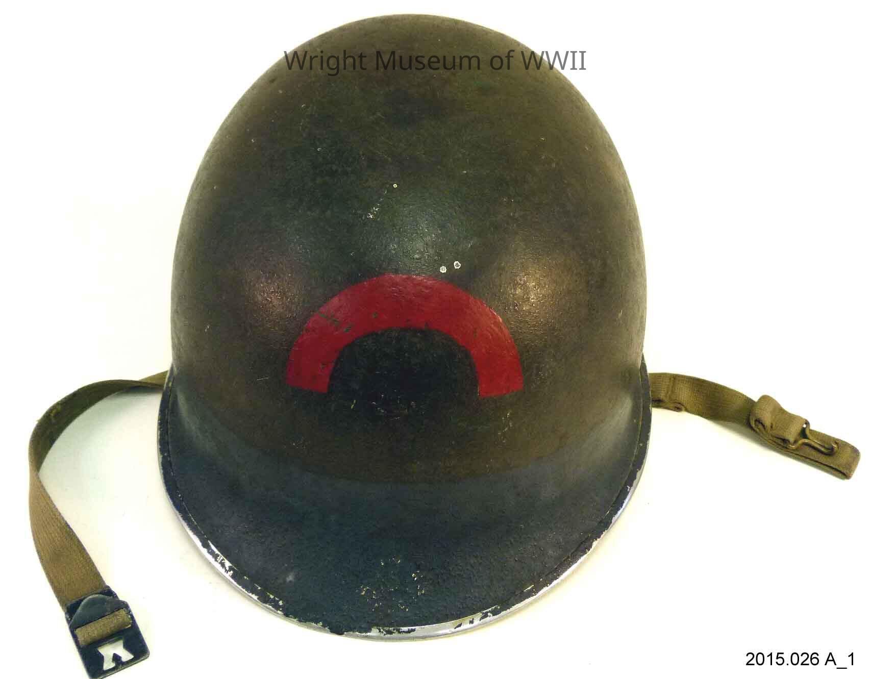 Helmet, U.S., M1. Front seam, fixed bail. Overall painted olive drab. A dark gray band painted around botton 2" or so of helmet. In the back, the band has obscured a previously-painted "USN" in black letters. A new "USN" has been painted above the band. On the front a red arc has been painted. the arc is almost half a circle, the band being 3/4" wide and the diameter of the circle appx 3.625". The bottom ends of the arc are appx 1.5" above the top of the gray band. These markings are typical of those of the 6th and &th Naval Beach Battalions during the D-Day Landing. The 7th NBB typically had a numeral 7 painted on the front of the helmet as well. Inside the helmet has been marked "R J BARNARD" in reasonably large black letters, roughly parallel to the edge of the helmet and on the right side. It has also been marked "BARNEY" in smaller white letters perpendicular to the edge of the helmet in the very back. The name has been underlined twice in white. Also in the back of the helmet, above the "BARNEY" is "7th BB" in large black letters, somewhat worn off.
