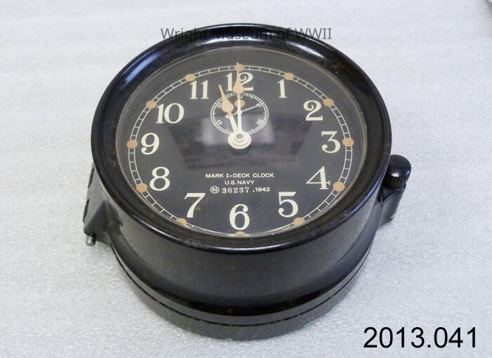 Mark I Deck Clock, US Navy, dated 1942. Black plastic case, which hinges open when a screw is loosened at right side. Clock has a black face with white numbers indicating the time of day (a smaller 60 minute face is inset above center. White metal hands on both clock faces. "MARK 1-DECK CLOCK / U.S. NAVY / N 36237, 1942" marked in white on the face of clock, below center. Maker's mark at very bottom edge of face in white: "MADE BY SETH THOMAS IN U.S.A." The clock case has a screw and bolt at reverse, presumably where it can be attached somewhere on the deck of a ship or boat. Remains of green paint around edge at back of case.Update Date