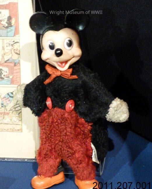 Hand puppet, in form of Mickey Mouse (Disney character). Fleece (textile) body with pouch/slit in which to insert hand. Painted plastic head. Body includes black top, red pants. white hands, red bow tie. Two red plastic buttons at waist. Black and beige head with painted eyes and nose. Orange plastic shoes. "MICKEY MOUSE" tag sewn to leg, with Walt Disney copyright mark. Copyright "WDP" at back of head (imprinted in plastic).Update Date
