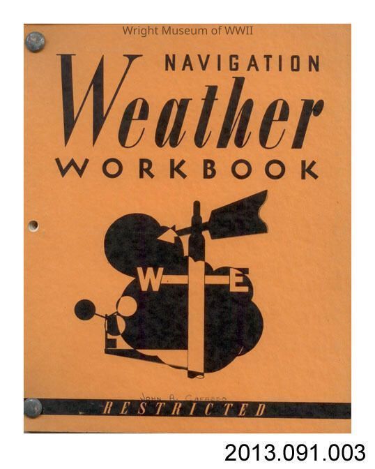 Workbook: "Navigation Weather Workbook." Prepared by the Army Air Forces Instructors' School (Navigator) at Selman Field, LA. Dated August, 1944. Orange paper cover with black print on front. Bound with metal rivets.