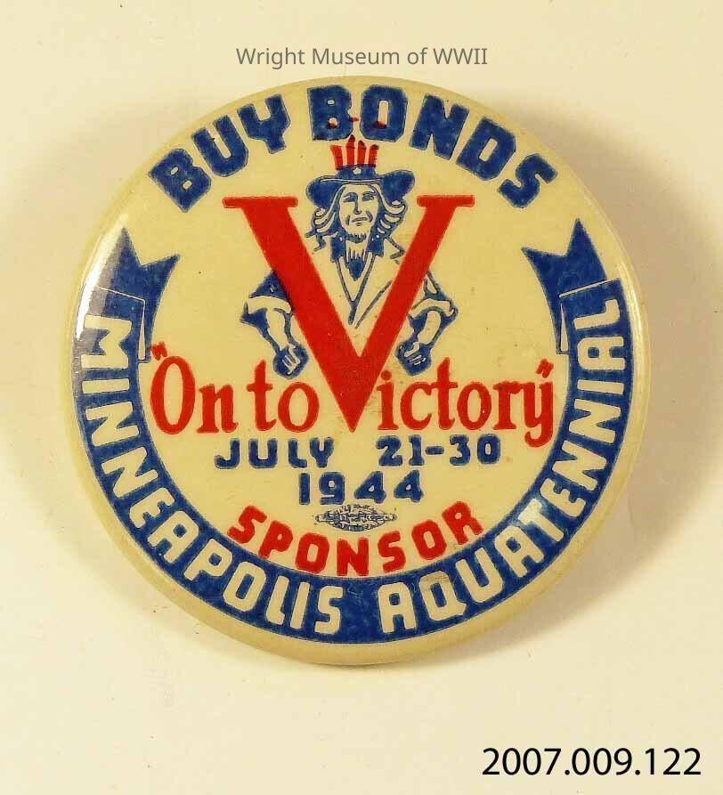 Civilian bond drive pin. White button with red and blue writing featuring Uncle Sam embracing a large red "V." Above that "Buy Bonds," below it "On to Victory July 21-30 1944 Sponsor" (the "V" in victory being the same one that Uncle Sam is embracing). And around the bottom edge "Minneapolis Aquatennial."Update Date