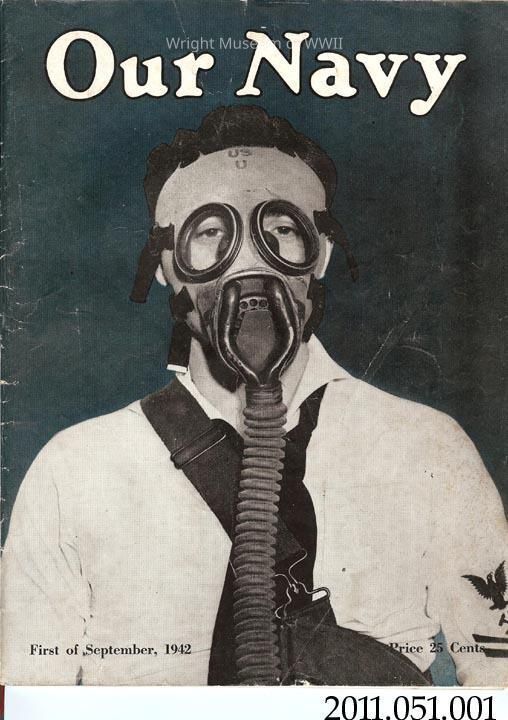 Magazine: "Our Navy". with black and white image of sailor in gas mask on front cover. Blue background on front cover. Issue is dated "First of September 1942". Color advertisement for Camel Cigarettes on reverse. 64 pages.Update Date