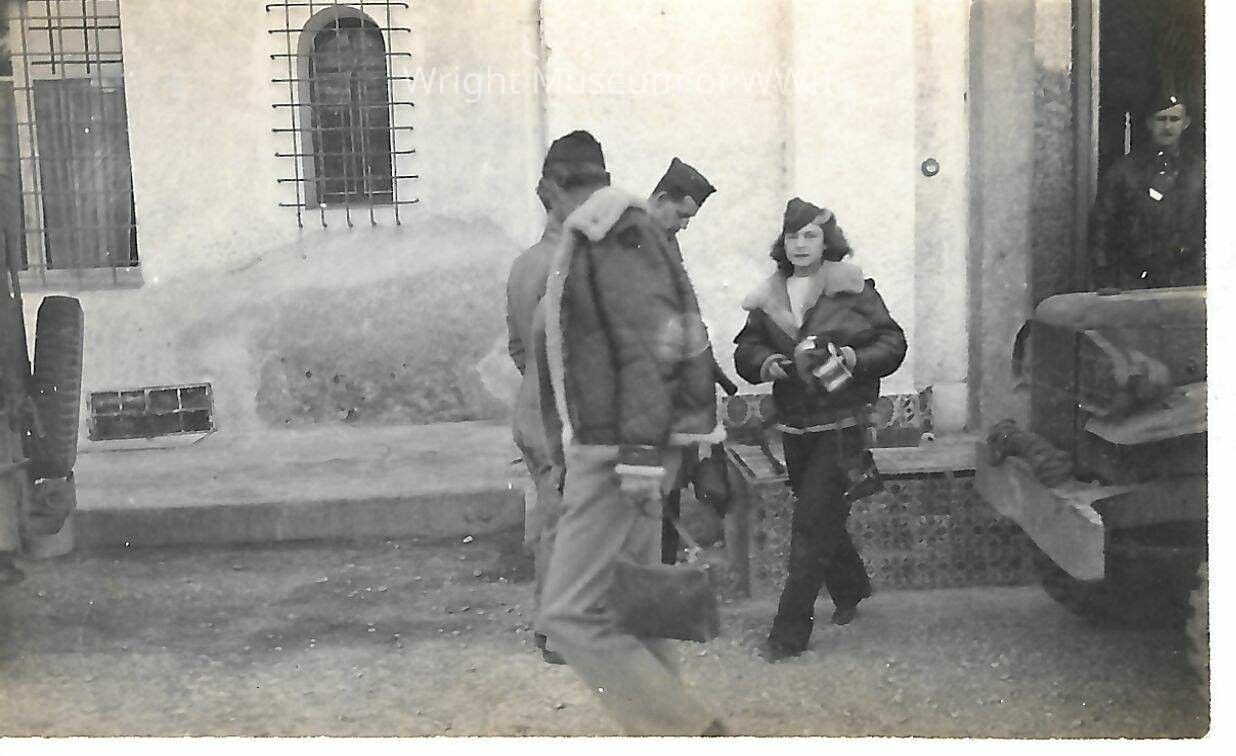 Photograph taken of famous WWII photographer Margaret Bourke White and various servicemen. Originally taken in Algeria, circa. 1942-43.