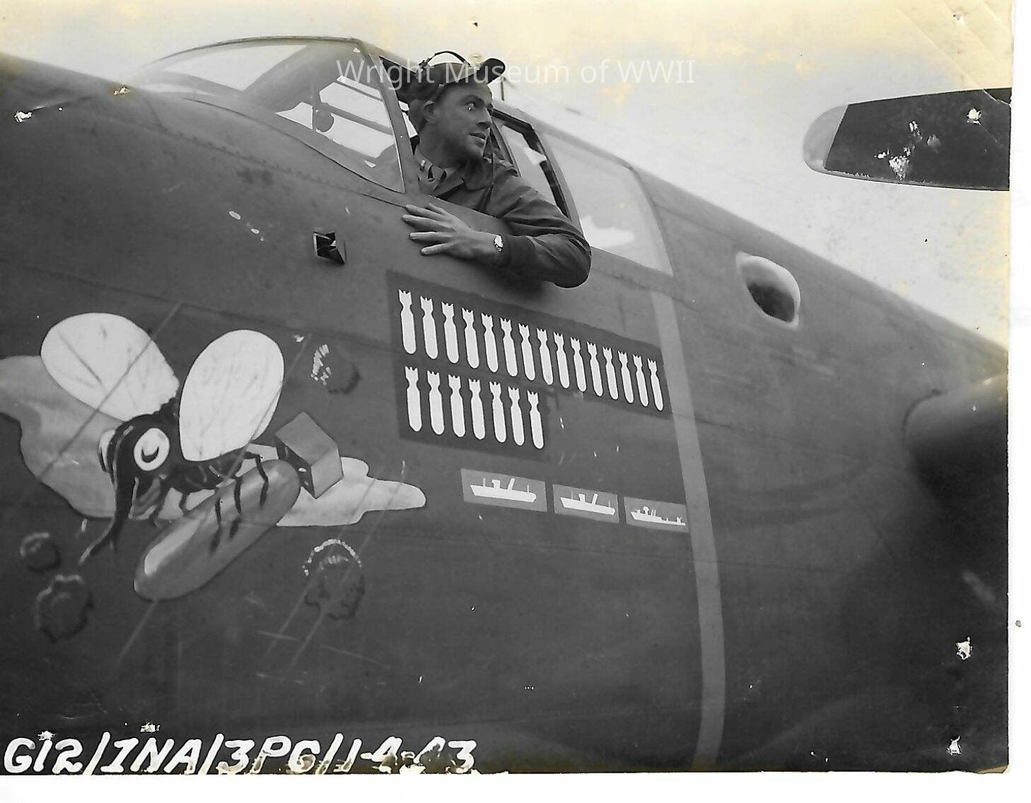 co-pilot of B-25 poses for photograph. B-25 has unnamed nose art featuring a fly with bomb. Originally taken in North Africa, circa. 1942-45. Part of 380th bomb. squadron of 310th bomb. group.Update Date