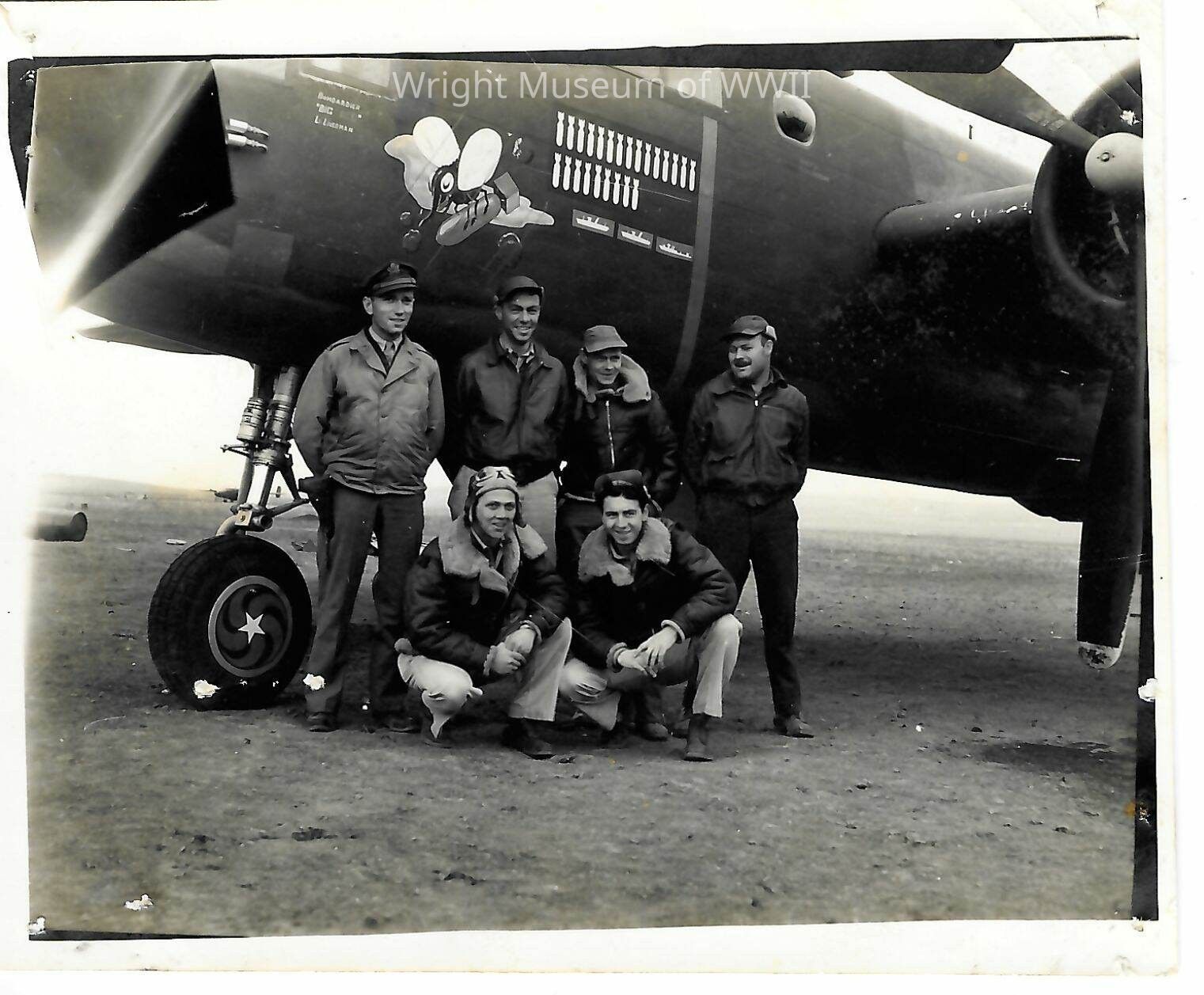 Aircrew poses in front of their B-25 with an unnamed nose art featuring a fly carrying a bomb. Photo originally taken in Africa, circa. 1942-45. Part of the 380th bomb. squadron of the 310th bomb. group.Update Date