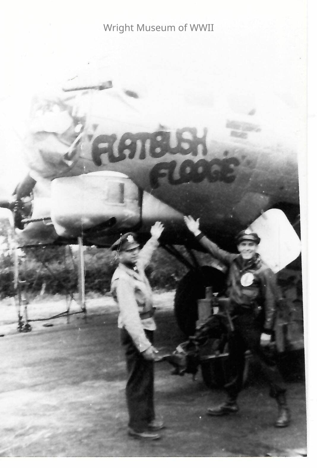 Photograph of B-17 "Flatbush Floogie". Crew members posed pointing at the nose art and name. Originally would have been taken circa. 1941-45.Update Date
