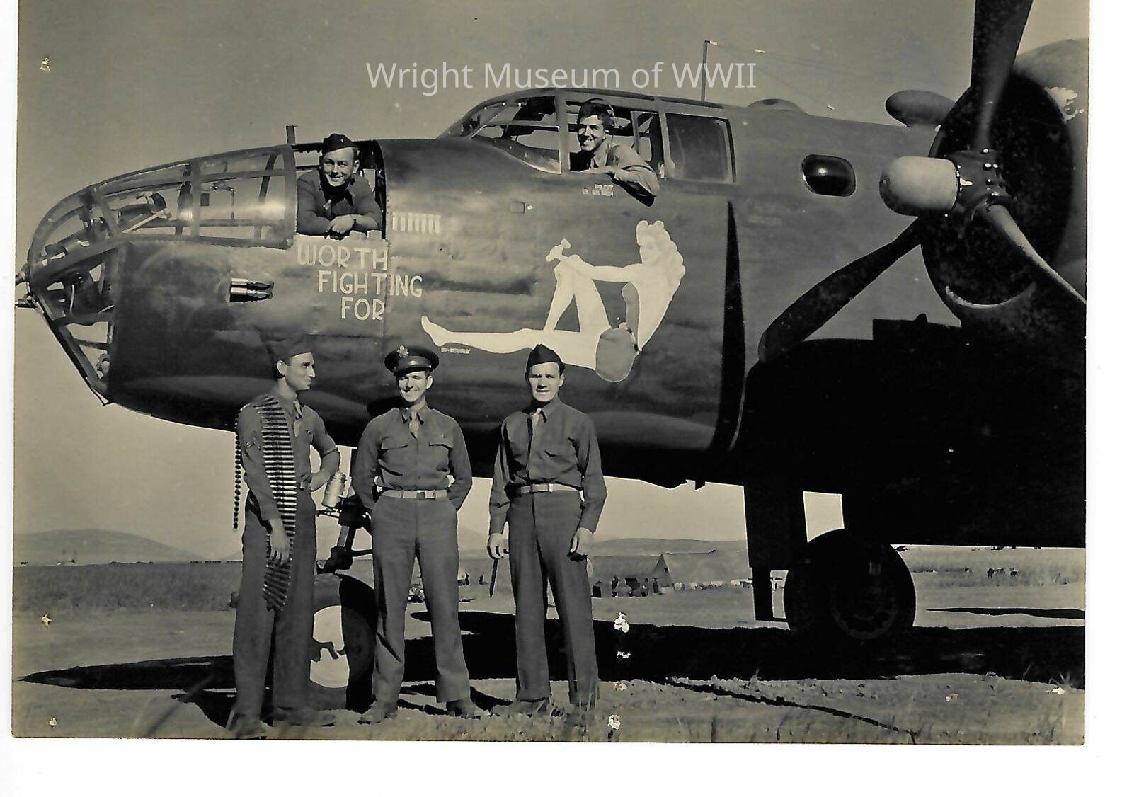 B-25 with "Worth Fighting For" pin-up nose art. Aircrew poses for photo both within and outside the aircraft. Photo originally taken in North Africa, 1942-45. Part of 380th bomb. squadron of the 310th bomb. groupUpdate Date