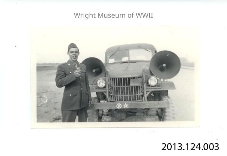 Photographic print, black and white snapshot of Robert Wanger in Army Air Forces uniform standing in front of an Army truck with two large speakers attached to front. Wanger is speaking or singing into a microphone which is wired to the truck. Barren landscape behind, with one building visible at right in distance. Handwritten inscription on reverse in black ink: "Kearns, Utah" "May 1943" and "Sound Truck."Update Date