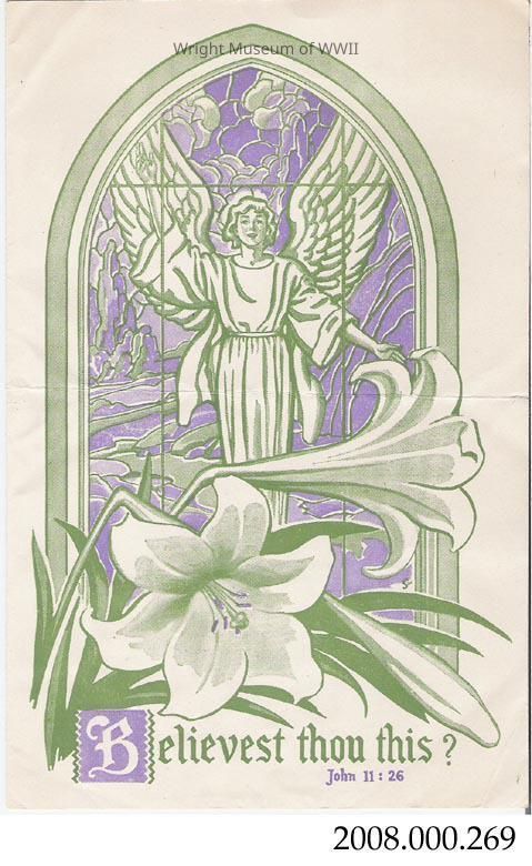 Inside left, schedule of service. Inside right, list of members in the parish serving in the armed forces. Front illustration: green and purple angel image in a window with flowers "Believest thou this? John 11:26". Poem and decoration on reverse.Update Date