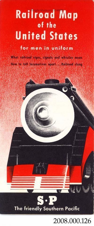 Map: "Railroad Map of the United states for Men in Uniform." Folding paper map with red and black printed illustration of train on front. "The Friendly Southern Pacific" printed at bottom. Includes map and other railroad related information for men in service. No date found.Update Date