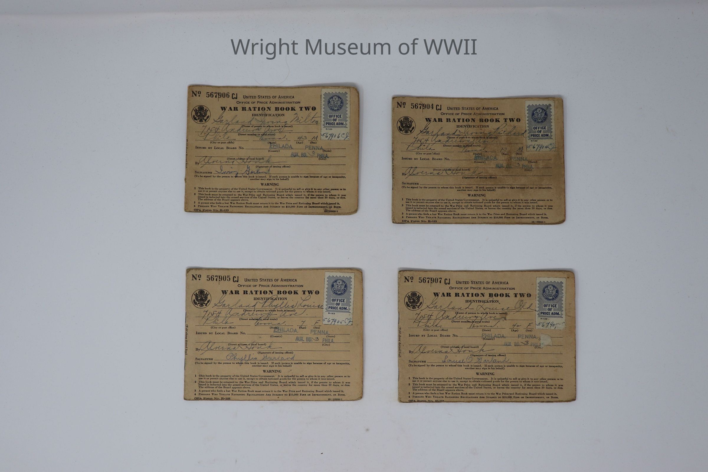 Set of 4 ration books belonging to members of Garland family; series # 567904-567907; books are all empty of stamps.