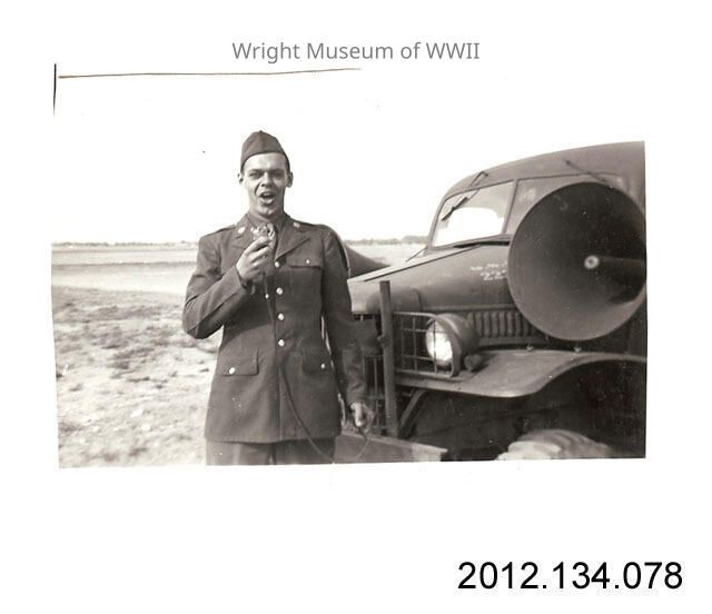 Photographic print. Black and white snapshot of Robert Wanger in Army Air Forces dress (winter) uniform, in front of a military vehilce with loudspeaker - Wanger is holding the microphone to the loudspeaker in front of his face. Inscription in black ink on reverse: "Kearns, Utah May / In front of sound truck / the mike / May 1943". A portion of the inscription at right was probably trimmed away when border of photograph was cut. (Probably taken at the Kearns Army Air Base).Update Date