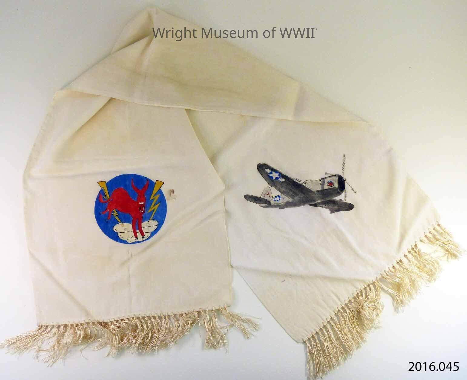 White silk aviator's scarf with white fringe. At one end a hand painted picture of a P-47 Thunderbolt and at the other a stylized red donkey on a blue background with two yellow lightning bolts. This might be a modification of the squadron insignia of the 320th Fighter Squadron, which flew P-47s and was based at Westover, MA for a time.Update Date