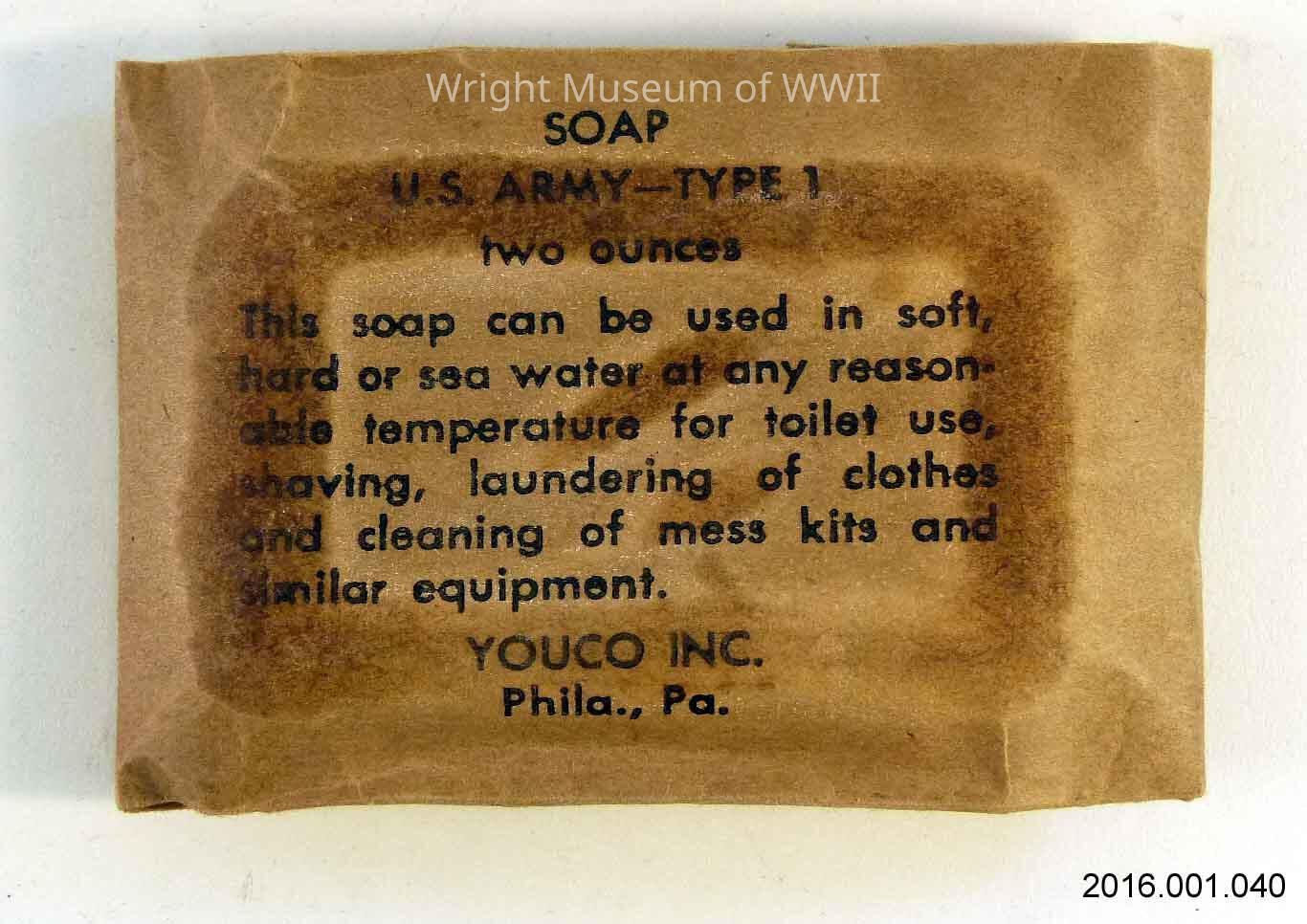 Soap, U.S. Army-Type 1. A small bar of soap in original brown paper container. Marked on one side "Soap - U.S. Army-Type 1 - two ounces - This soap can be used in soft, hard or sea water at any reasonable temperature for toilet use, shaving, laundering of clothes and cleaning of mess kits and similar equipment." Under that "Youco Inc. - Phila., Pa."Update Date