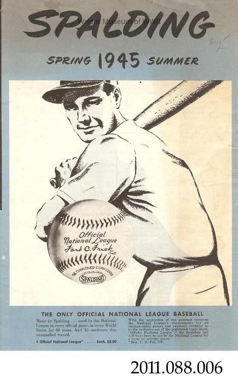 Brochure or catalog for Spalding sporting goods, dated Spring, Summer 1945. Paper, one sheet, folded accordion style. Black and white text with blue backgrounds. Illustration of baseball player on front and sporting equipment throughout. "Army Navy E" article on reverse, showing how each of the Company's three plants received the E award.Update Date