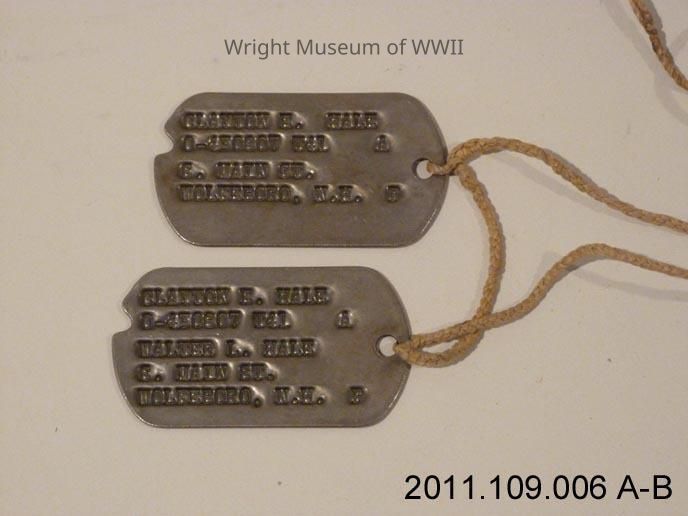 Pair of dog tags, each attached to a piece of twine. "CLAYTON E. HALE / 0-430807 T41 / S. MAIN ST. / WOLFEBORO, NH" and letters "A" and "P" at right. Notch in edge of dog tag at upper left.Context