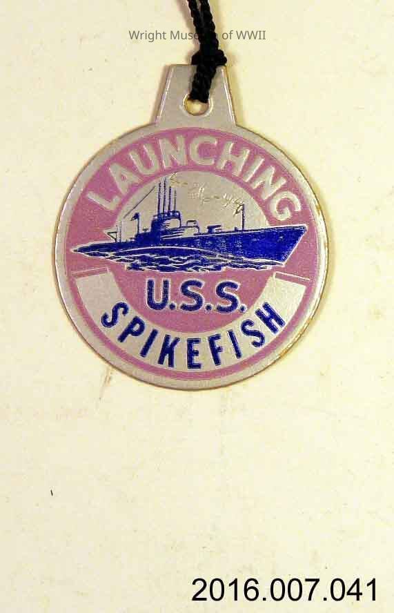Tag, launch, U.S. Navy, submarine, USS Spikefish. Round cardstock launch tag for USS Spikefish. Background silver with purple and blue drawing of submarine. "Launching" at top and "U.S.S. Spikefish" at bottom. Both sides identical. Someone has written "4-26-44" on one side in pencil. Purple string at top.Update Date