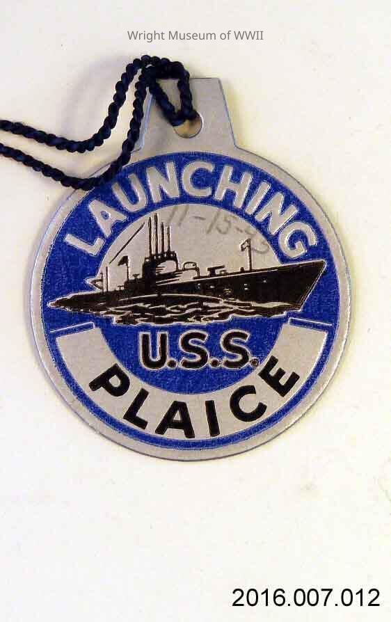 Tag, launch, U.S. Navy, submarine, USS Plaice. Round cardstock launch tag for USS Plaice. Background silver with blue and black drawing of submarine. "Launching" at top and "U.S.S. Plaice" at bottom. Both sides identical. Someone has written "11-15-45" on one side in pencil. Purple string at top.Update Date