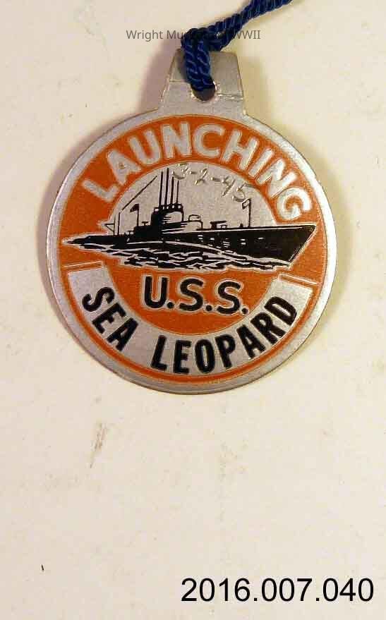 Tag, launch, U.S. Navy, submarine, USS Sea Leopard. Round cardstock launch tag for USS Sea Leopard. Background silver with orange and black drawing of submarine. "Launching" at top and "U.S.S. Sea Leopard" at bottom. Both sides identical. Someone has written "3-2-45" on one side in pencil. Blue string at top.Update Date
