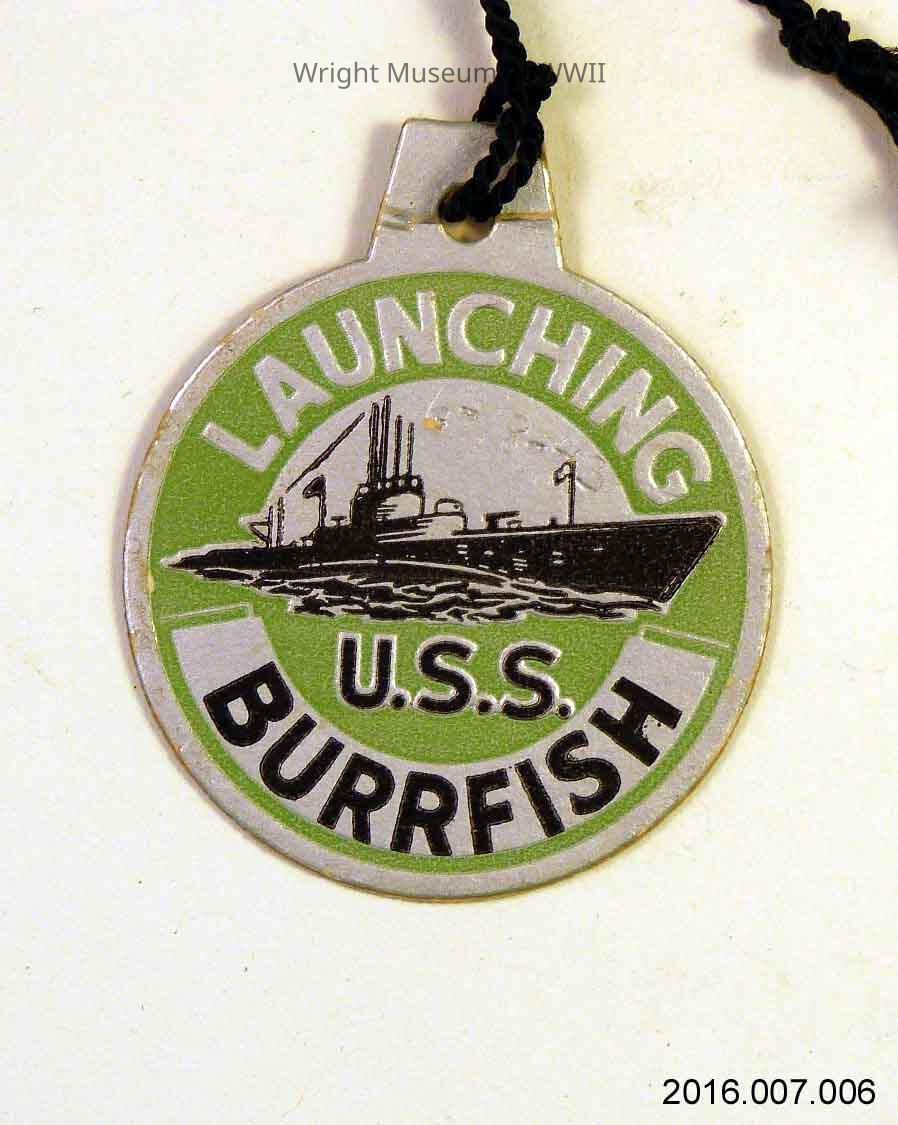 Tag, launch, U.S. Navy, submarine, USS Burrfish. Round cardstock launch tag for USS Burrfish. Background silver with light green and black drawing of submarine. "Launching" at top and "U.S.S. Burrfish" at bottom. Both sides identical. Someone has written "6-18-43" on one side in pencil. Black string at top.Update Date