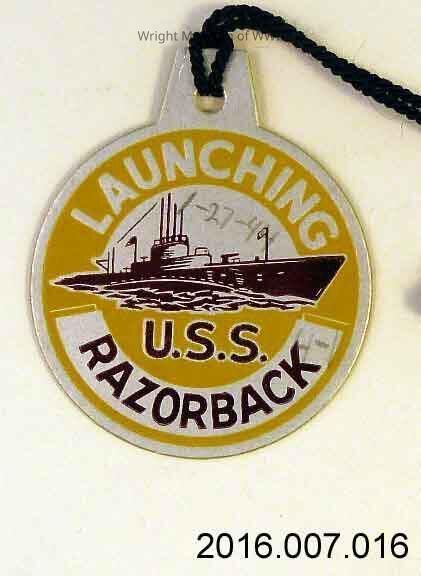 Tag, launch, U.S. Navy, submarine, USS Razorback. Round cardstock launch tag for USS Razorback. Background silver with yellow and maroon drawing of submarine. "Launching" at top and "U.S.S. Razorback" at bottom. Both sides identical. Someone has written "1-27-44" on one side in pencil. Purple string at top.Update Date