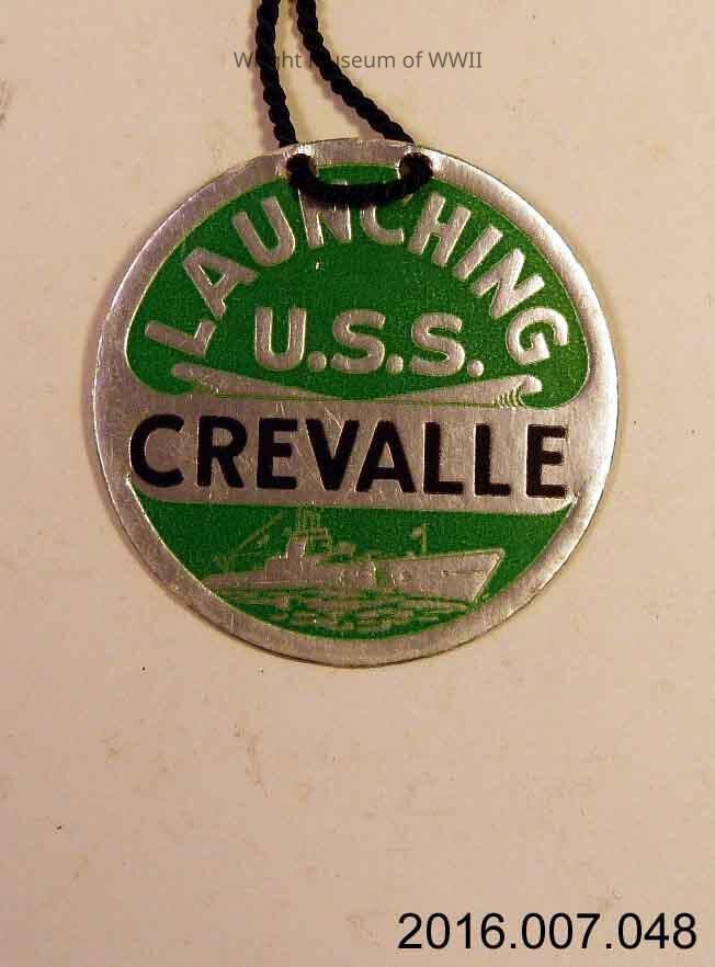 Tag, launch, U.S. Navy, submarine, USS Crevalle. Round cardstock launch tag for USS Crevalle. Background silver with green and black drawing of submarine. "Launching" at top and "U.S.S. Crevalle" at bottom. Back blank. Black string at top.Update Date