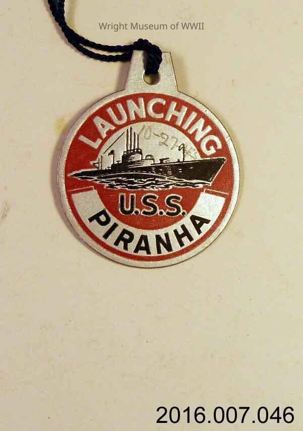 Tag, launch, U.S. Navy, submarine, USS Piranha. Round cardstock launch tag for USS Piranha. Background silver with red and black drawing of submarine. "Launching" at top and "U.S.S. Piranha" at bottom. Both sides identical. Someone has written "10-27-43" on one side in pencil. Purple string at top.Update Date