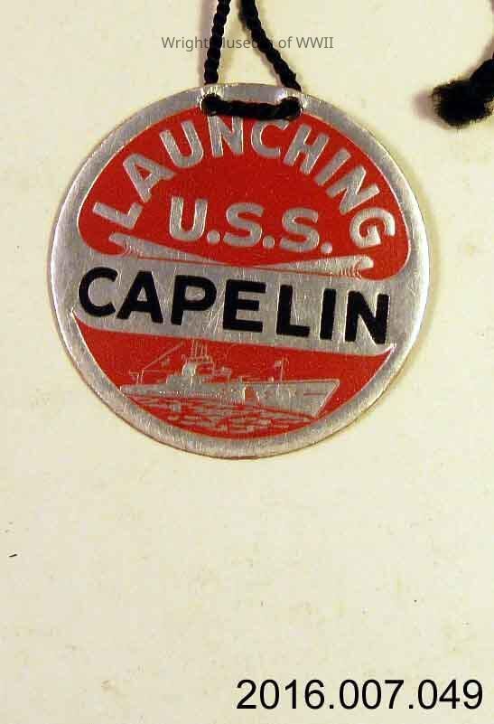 Tag, launch, U.S. Navy, submarine, USS Capelin. Round cardstock launch tag for USS Capelin. Background silver with red and black drawing of submarine. "Launching" at top and "U.S.S. Capelin" at bottom. Someone has written "Jan 20, 1943" on back. Black string at top.Update Date