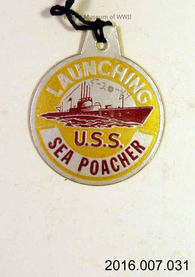 Tag, launch, U.S. Navy, submarine, USS Sea Poacher. Round cardstock launch tag for USS Sea Poacher. Background silver with yellow and red drawing of submarine. "Launching" at top and "U.S.S. Sea Poacher" at bottom. Both sides identical. Someone has written "5-20-44" on one side in pencil. Purple string at top.Update Date