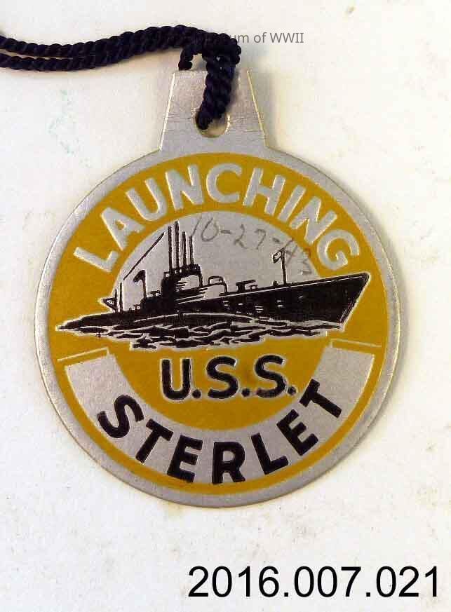 Tag, launch, U.S. Navy, submarine, USS Sterlet. Round cardstock launch tag for USS Sterlet. Background silver with yellow and black drawing of submarine. "Launching" at top and "U.S.S. Sterlet" at bottom. Both sides identical. Someone has written "10-27-43" on one side in pencil. Purple string at top.Update Date