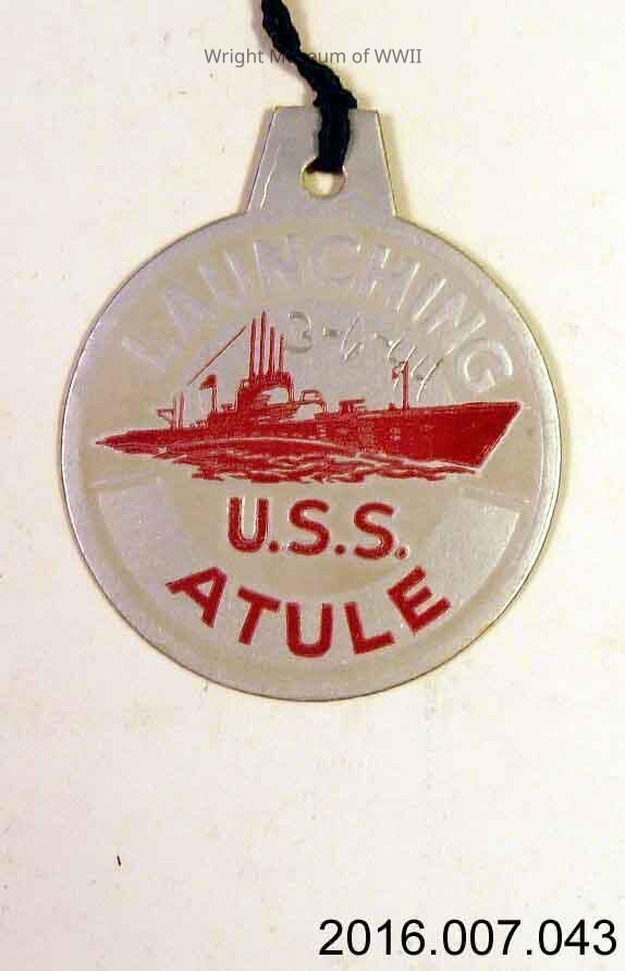 Tag, launch, U.S. Navy, submarine, USS Atule. Round cardstock launch tag for USS Atule. Background silver with silver and red drawing of submarine. "Launching" at top and "U.S.S. Atule" at bottom. Both sides identical. Someone has written "3-6-44" on one side in pencil. Purple string at top.Update Date