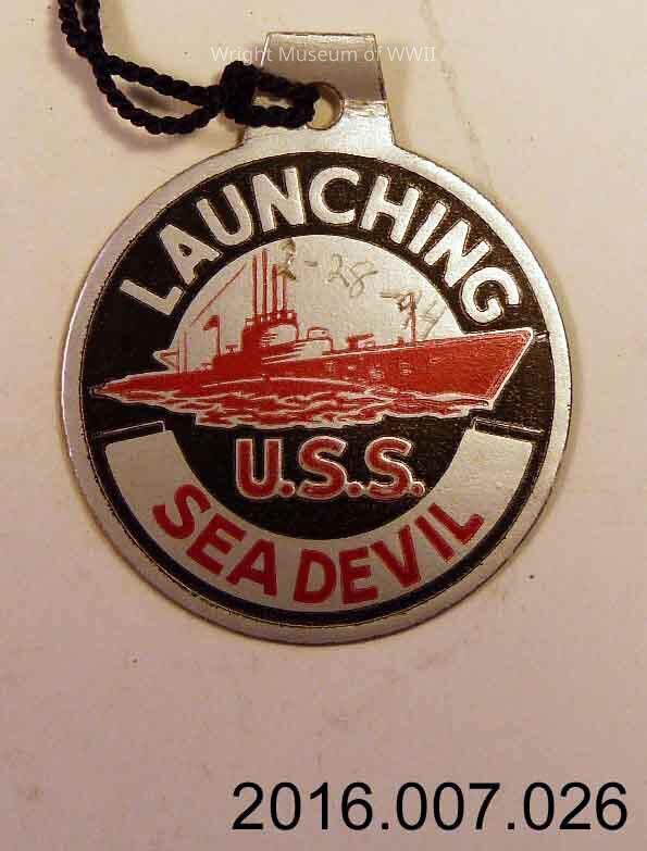Tag, launch, U.S. Navy, submarine, USS Sea Devil. Round cardstock launch tag for USS Sea Devil. Background silver with black and red drawing of submarine. "Launching" at top and "U.S.S. Sea Devil" at bottom. Both sides identical. Someone has written "2-28-44" on one side in pencil. Purple string at top.Update Date