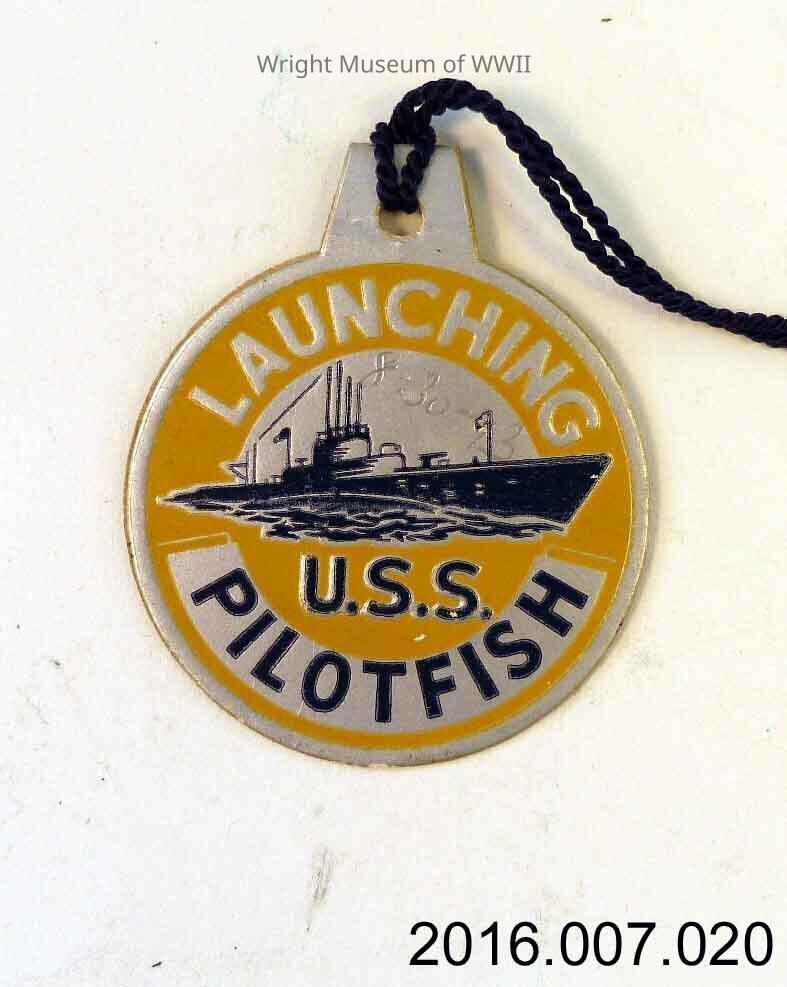 Tag, launch, U.S. Navy, submarine, USS Pilotfish. Round cardstock launch tag for USS Pilotfish. Background silver with yellow and blue drawing of submarine. "Launching" at top and "U.S.S. Pilotfish" at bottom. Both sides identical. Someone has written "8-30-43" on one side in pencil. Purple string at top.Update Date