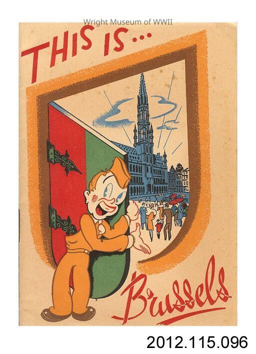Small softcover book, travel guide: "This is Brussels". Beige cardstock covers with colorful printed illustration of an American soldier opening a door to reveal the city of Brussels. 32 pages, bound with staples. Published by the Belgium Leave Section, CHANOR Base Section, US Army for American military personnel stationed in or traveling to Brussels. Includes travel information about the city, as well as maps.Update Date
