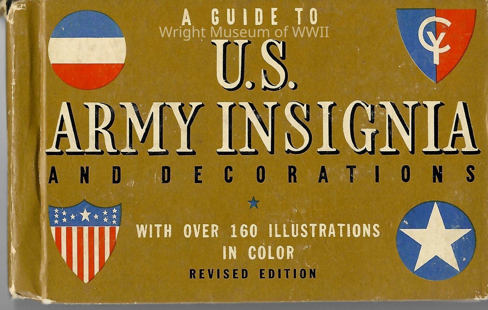 Illustrated guidebook " A Guide to U.S. Army Insignia and Decorations". Brown cover with various emblems of the United States. Revised Edition. Light wear on front cover. Books spine has tear at top. Back cover has a "Buy War Bonds and Stamps" advertisement. Published in 1942.Update Date