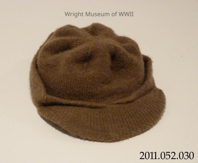 Olive green wool winter cap, brim at front. Used by US Army, World War II. Worn by Martin O. Lindon, US Army. Remnants of a size label inside.