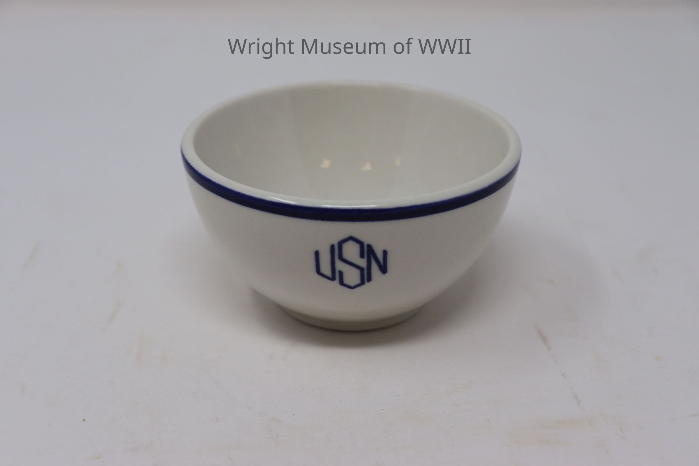 White ceramic coffee cup with blue strip around rim and USN in blue on side