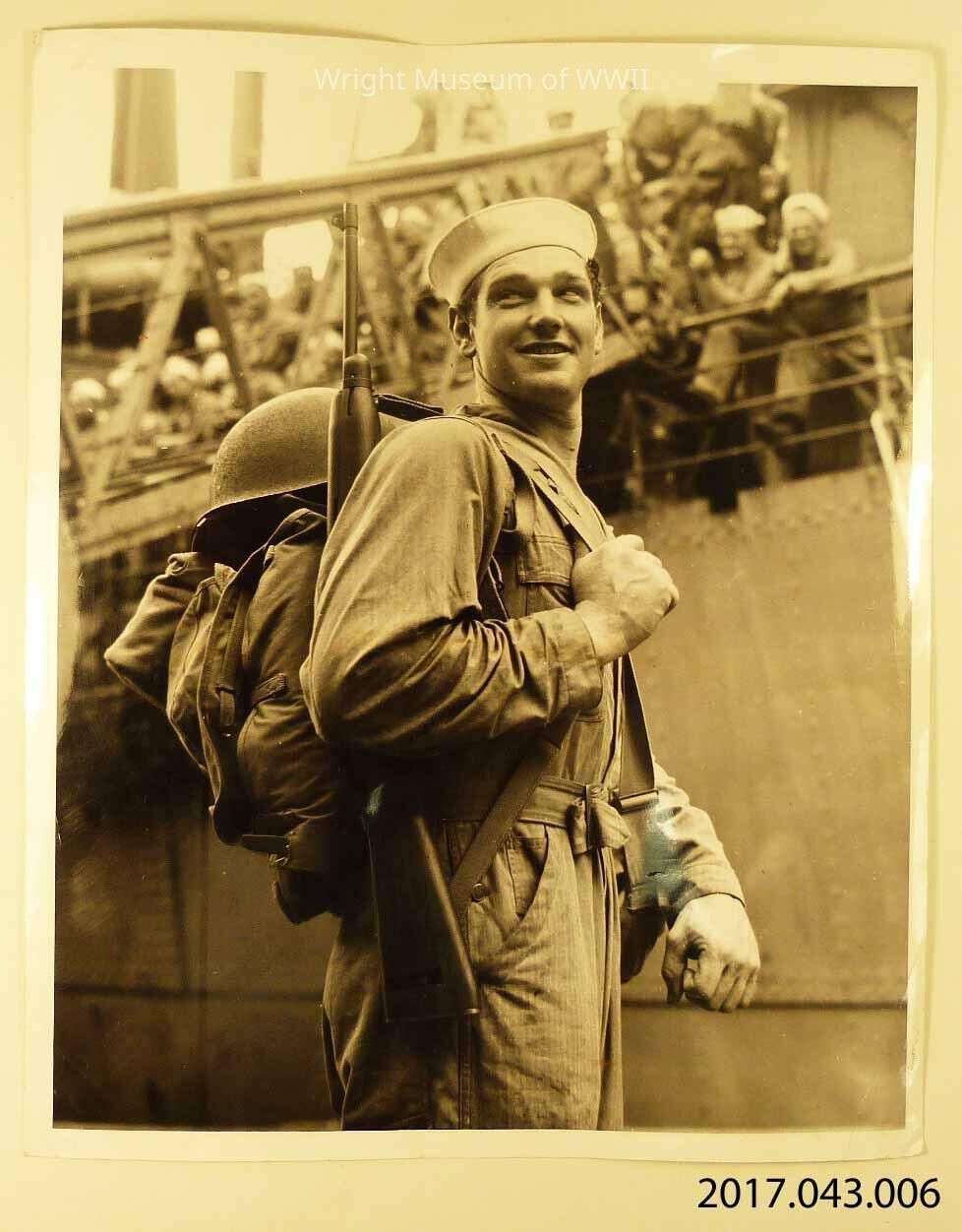 Photograph, official U.S. Navy. An actual, original official photograph, with blue print on the back, The subject is the iconic Sea Bee in HBT coveralls, M1 Carbine and dixie cup. Dated 20 April 43.