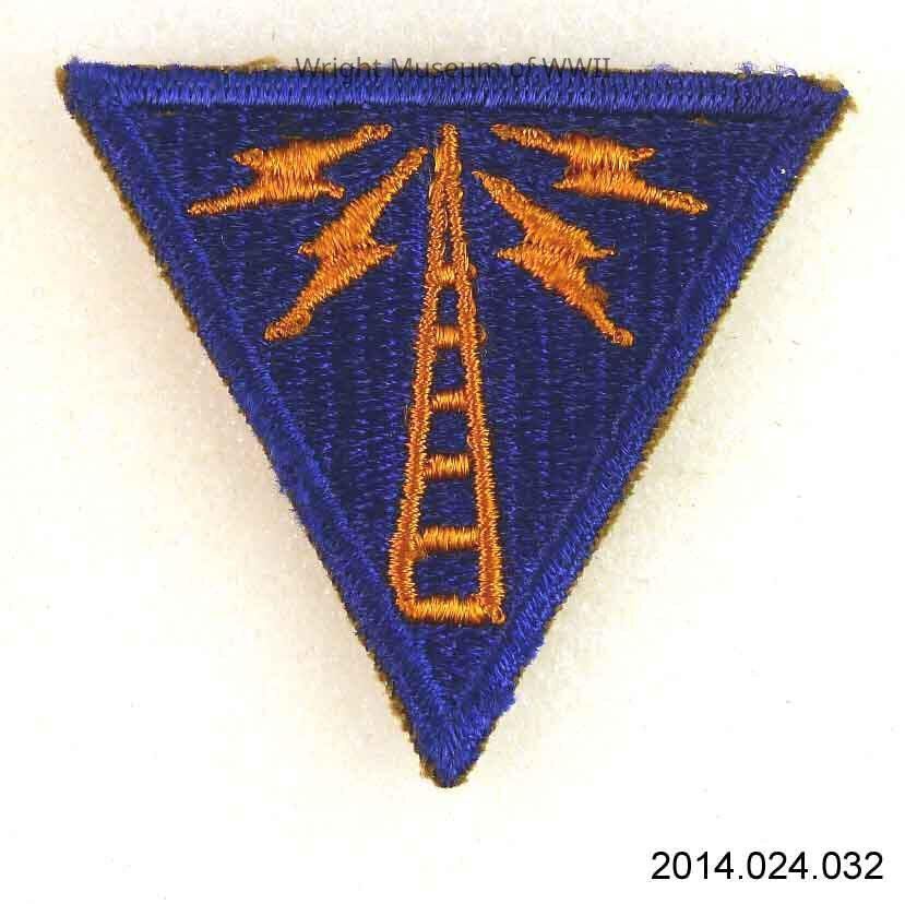 Insignia, Patch, U.S., qualification, Army Air Forces Communications Specialist. A fully embroidered patch. A blue triangle, worn point down on the sleeve cuff, bearing an orange/gold radio tower emitting 4 lightning bolts. Cut edge, white back.Update Date