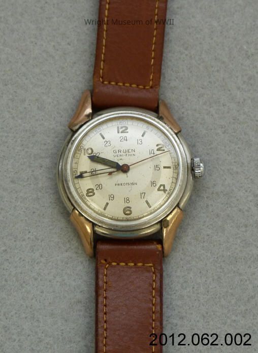 Wristwatch (used by US Army Air Forces). Watch has stainless steel case with brass colored strap or band mounts. Three dials on face: traditional 12 hours, 24 count, and 60 count. "GRUEN / W BASE METAL" on reverse, and in tiny scratched numbers: "E1044".Update Date