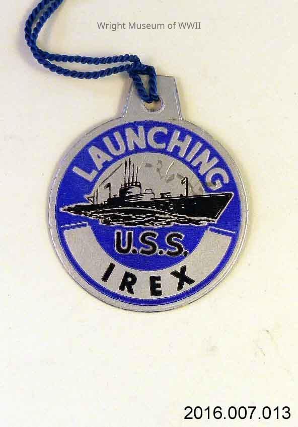 Tag, launch, U.S. Navy, submarine, USS Irex. Round cardstock launch tag for USS Irex. Background silver with purple and black drawing of submarine. "Launching" at top and "U.S.S. Irex" at bottom. Both sides identical. Someone has written "1-26-45" on one side in pencil. Blue string at top.Update Date