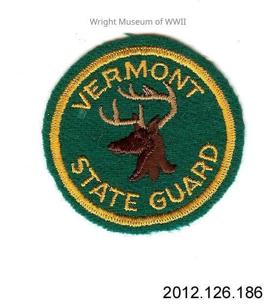Patch, unit affiliation, Vermont State Guard. Round patch, embroidered design on green wool backing. "VERMONT STATE GUARD" embroidered in yellow, with a brown embroidered deerhead logo at center. Embroidered yellow border around edge of patch. Cheesecloth backing.Update Date
