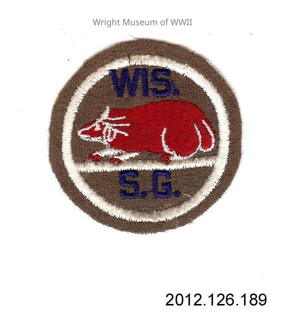 Patch, unit affiliation, Wisconsin State Guard . Round patch, embroidered design on light brown wool backing. A red and white embroidered badger at center. "WIS" and "SG" embroidered in blue above and below the animal at center. Embroidered white border around edge of patch. Cheesecloth backing.Update Date