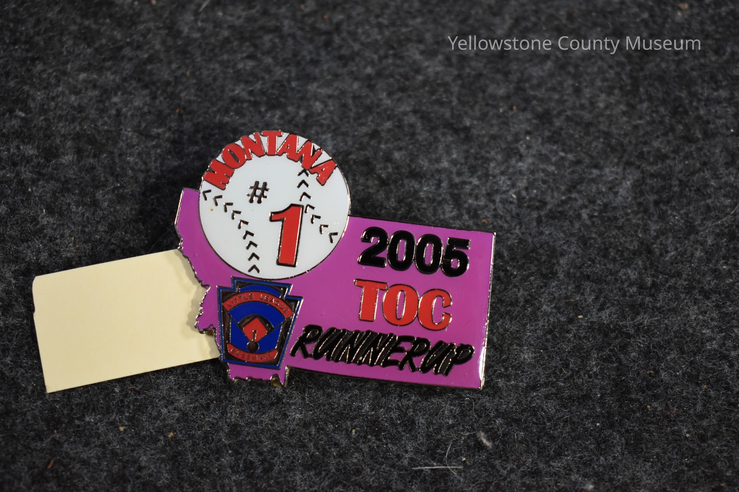 A purple montana shaped pin with a baseball in the upper lefthand corner. The baseball says "Montana 1" and the state portion of the pin says "2005 TOC Runnerup." The lower lefthand corner has the Little League Baseball logo.Acquisition