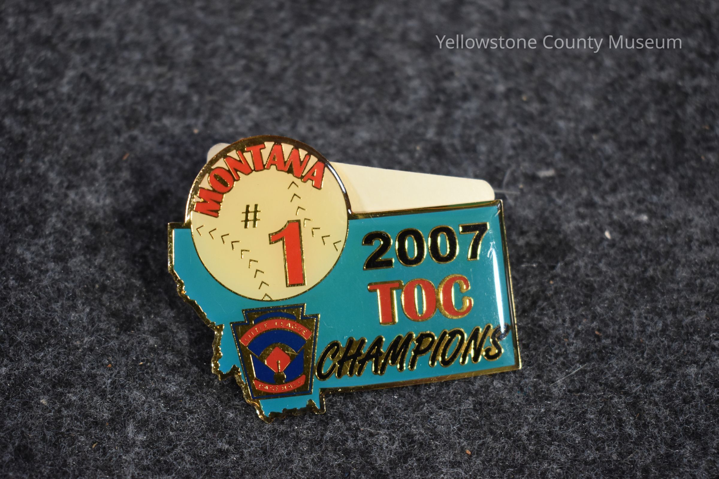 A cyan Montana shaped pin with a white baseball in the upper lefthand corner. The baseball says "Montana 1" and the state portion of the pin says "2007 TOC Champions." In the bottom lefthand corner has the Little League Baseball logo.Acquisition
