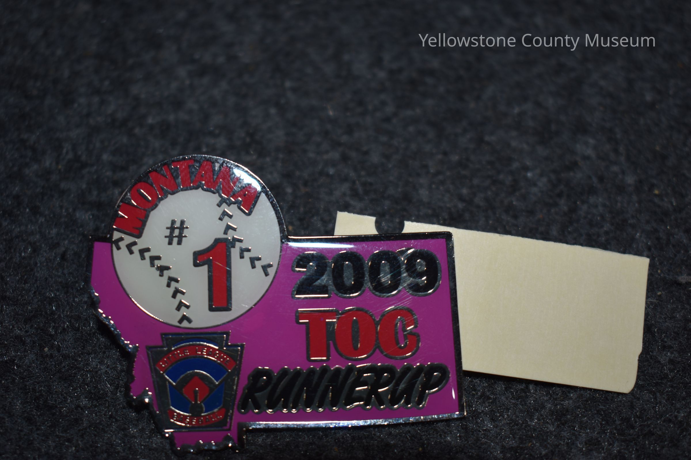 A purple montana shaped pin with a baseball on the upper left corner. The baseball says "Montana 1" and the state portion of the pin says 2009 TOC Runner up with a Little League Baseball logo on the bottom lefthand corner.Acquisition