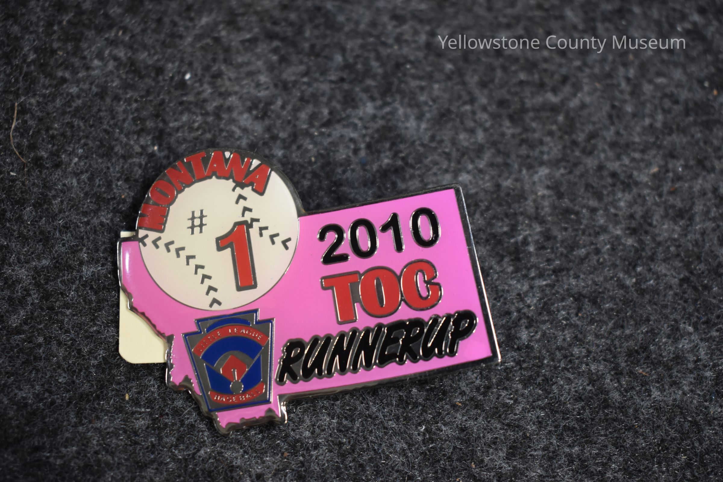A pink montana shaped pin with a baseball in the upper lefthand corner. The baseball says "Montana 1," and the state portion of the pin says "2010 TOC Runnerup." The Little League Baseball logo is in the lower lefthand corner.Acquisition